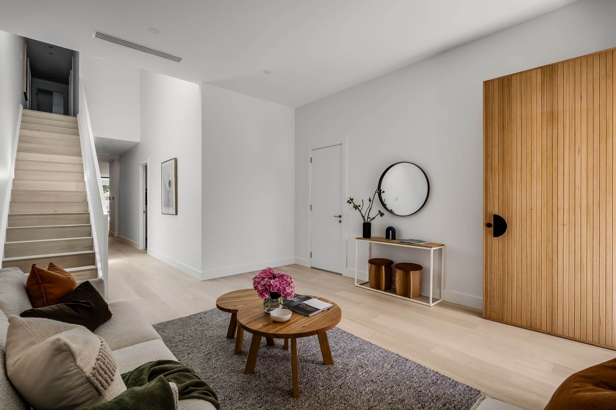 The project also included the design and installation of a custom timber staircase with precision-made nosings to match the flooring. The result is a cohesive, high-end aesthetic that complements the home’s contemporary architecture and craftsmanship.