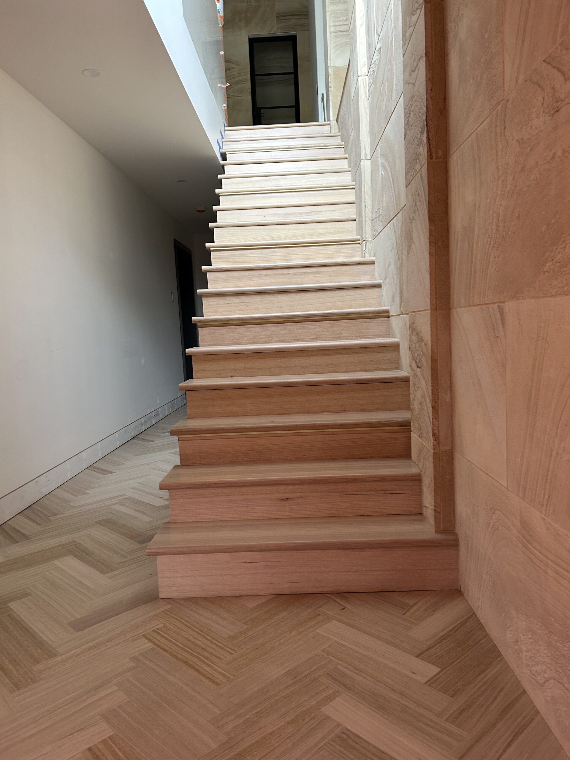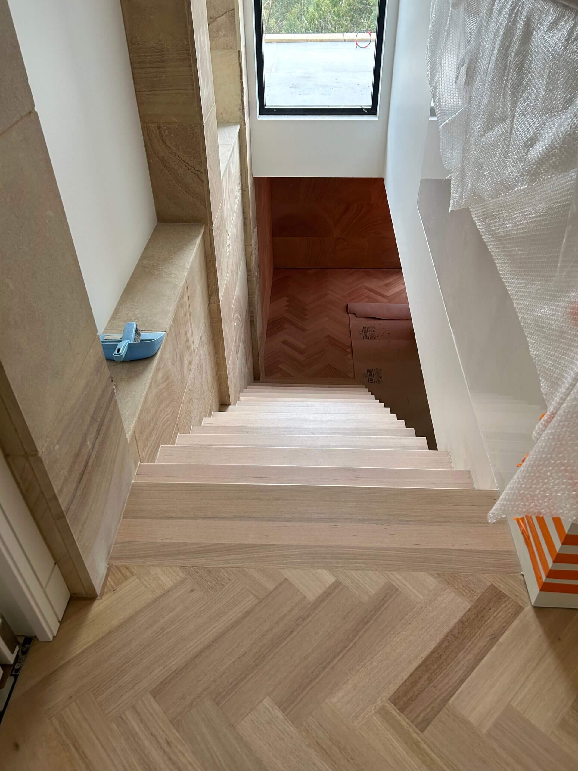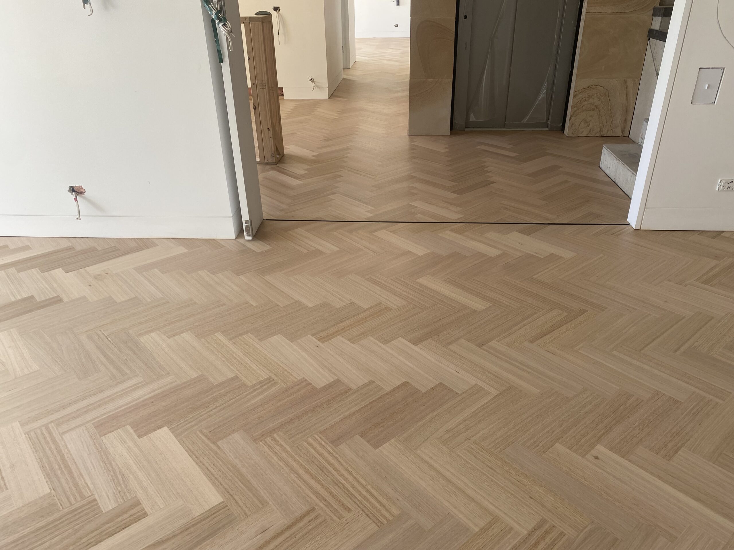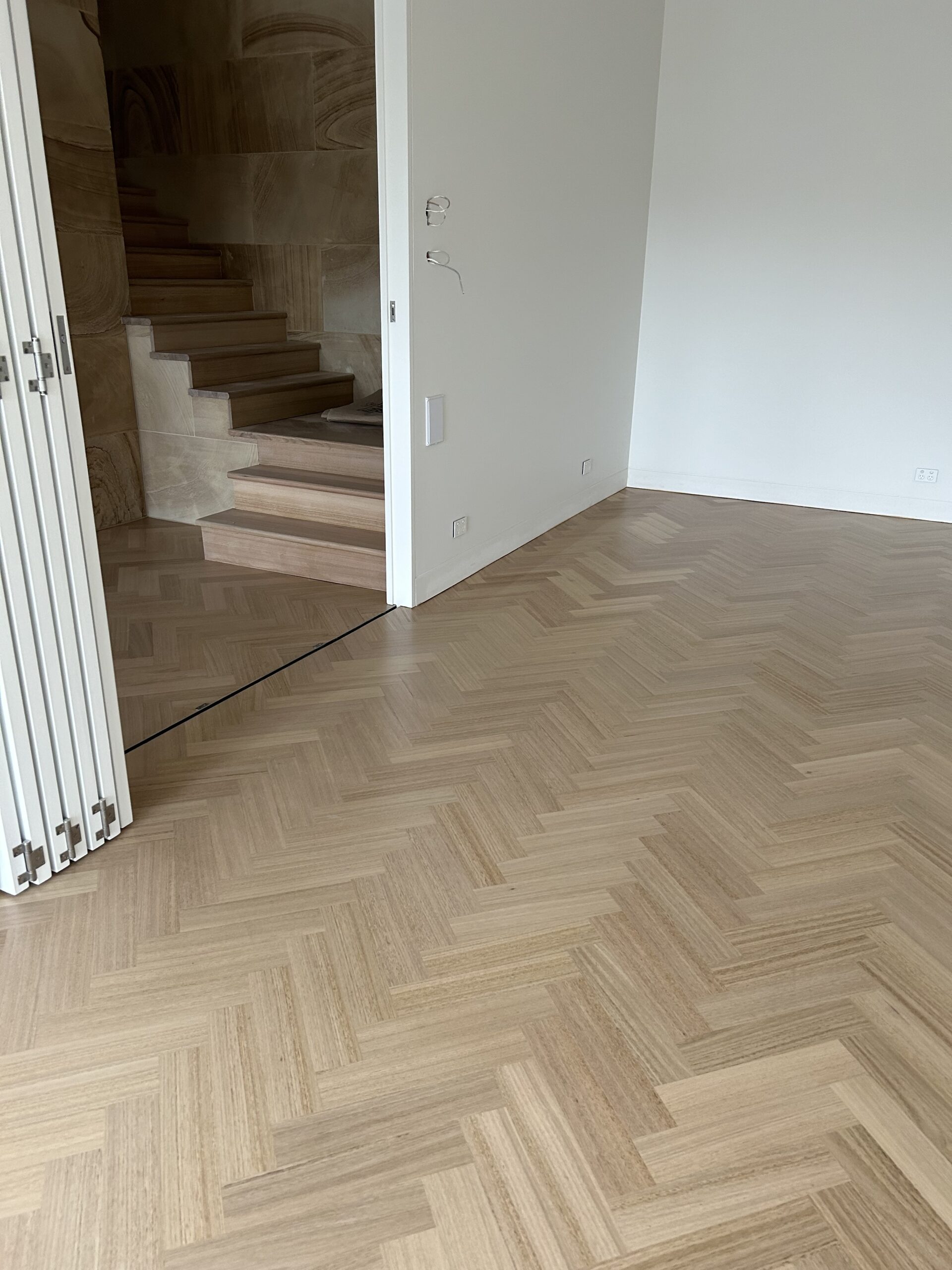 For this architect-designed home, FloorCraft supplied and installed custom-sized solid Tasmanian Oak parquetry across three levels, including two staircases and elevator detailing. The floor was finished with a white-toned polyurethane system to meet the client’s exact specifications. Despite a complex site layout and limited material availability, the team achieved a flawless, high-end finish that exceeded expectations.